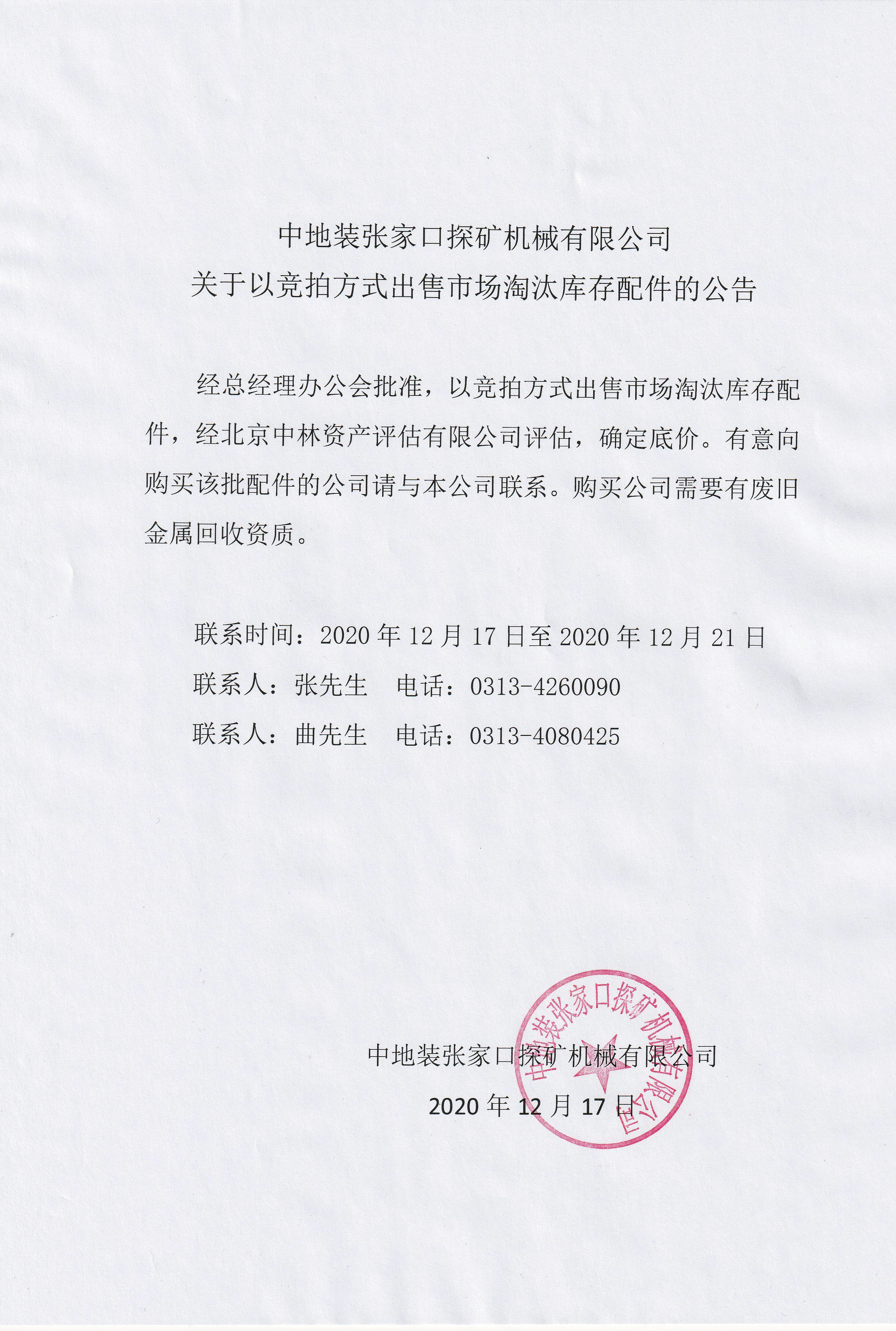 中地裝張家口探礦機械有限公司關(guān)于以競拍方式出售市場淘汰庫存配件的公告